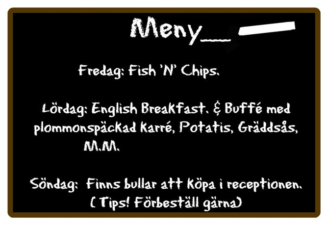 Fredag: På kvällen var det Fish N' Chips. Man medtog egen dricka.
